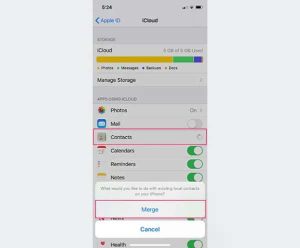 STEP #4 | To ensure the contacts on your iPhone are syncing with iCloud make sure this is either showing in green or if not slide the toggle to the right so it turns green, then tap “Merge” to allow “Contacts,” which will be near the top of the list.